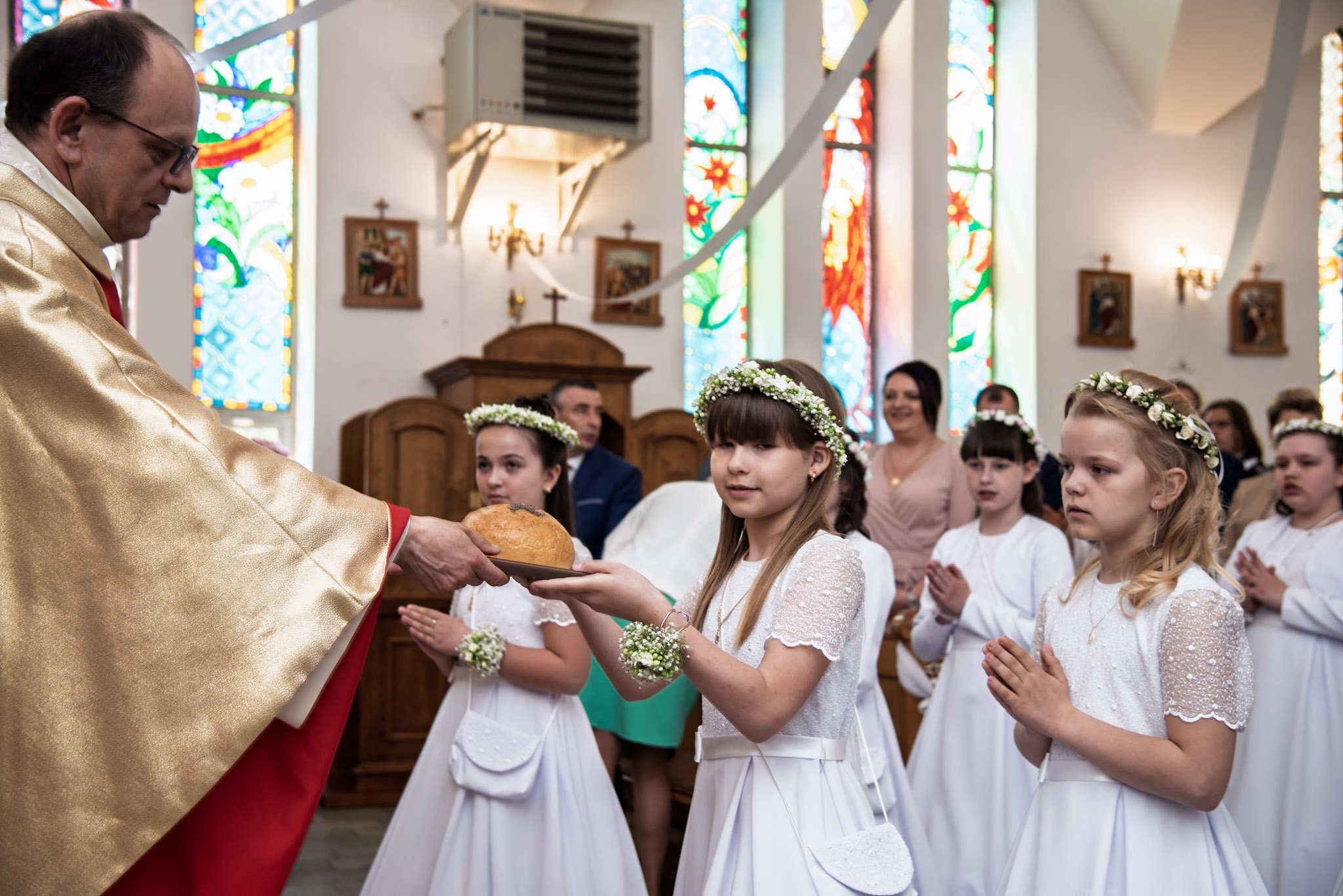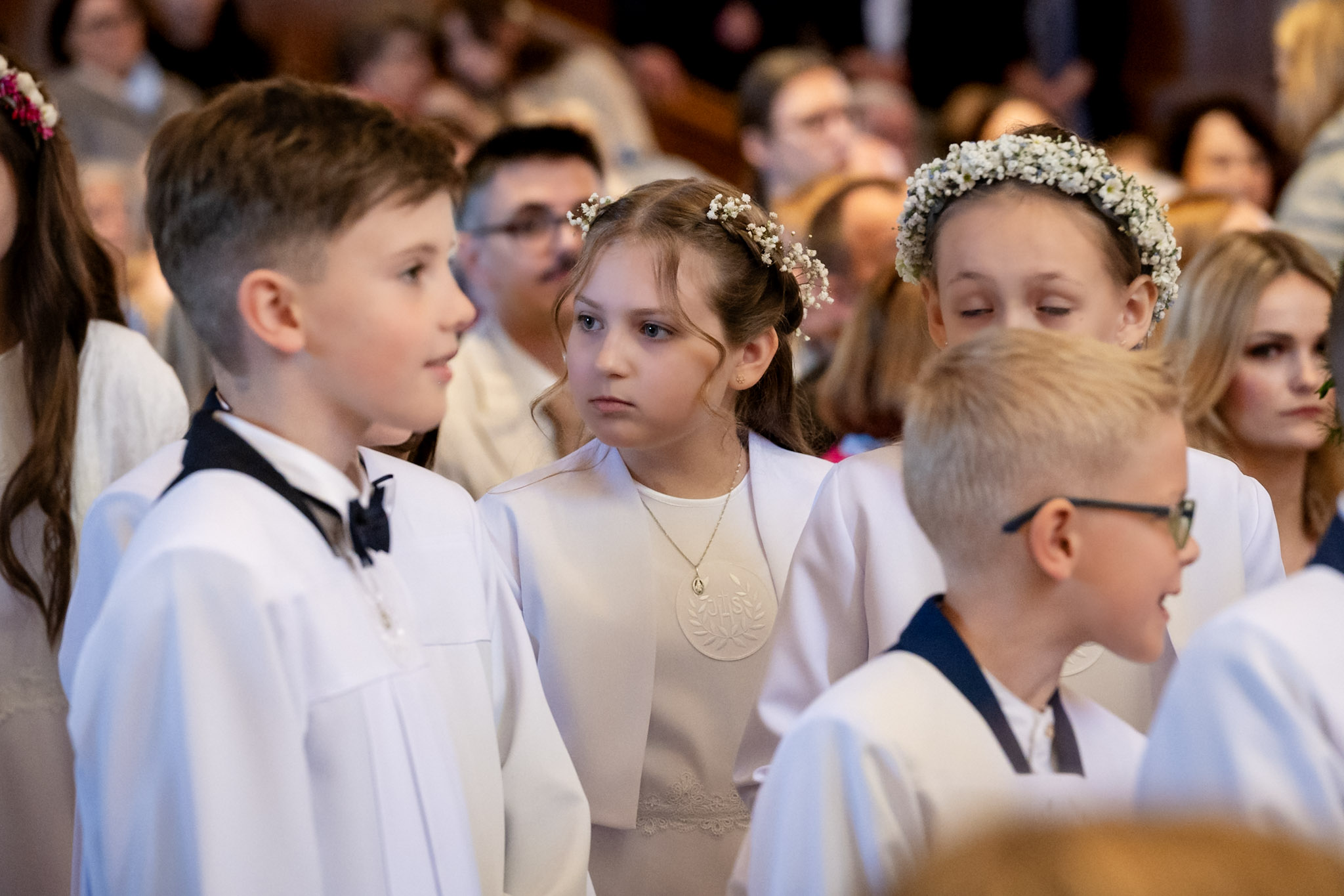 Podczas fotografowania staram się pracować możliwie naturalnie, unikając używania dodatkowego oświetlenia (chyba że warunki w kościele są wyjątkowo trudne). Obserwuję, reaguję i łapię momenty, które tworzą prawdziwą historię tego dnia — emocje dzieci, wzruszenie rodziców, gesty, detale i atmosferę uroczystości.